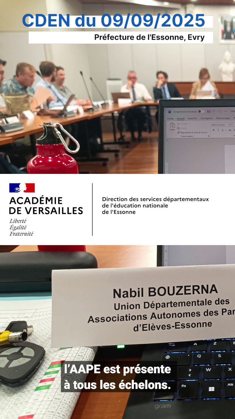 Nous disposons d’un siège au Conseil Départemental de l’Education Nationale de l’Essonne (CDEN 91) présidé par la Directrice Académique des services de l’Education Nationale de l’Essonne.